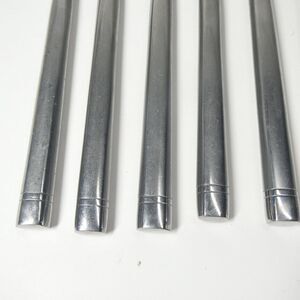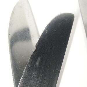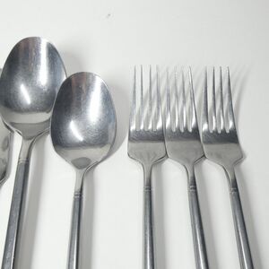 Lot of stainless flatware in the discontinued Ritz pattern by Hampton Silversmiths. This 11 piece lot includes a mix of forks, spoons, and knives, as shown. Fair shape with some overall wear from use. One of the knives has some gouges out of the side of the blade.