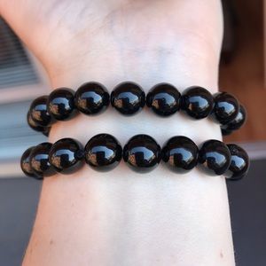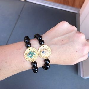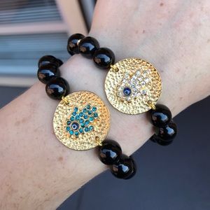SMOKE/PET FREE. Stretch. Handmade by me. 12mm black Agate stones with a CZ Hamsa connector in 18k yellow plated gold. Sold individually. Fits a 6 - 7 inch wrist (fits 6 inch loose and 7 inch more fitted) *Depending on availability can be sized up or down just leave a comment.