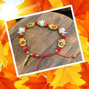 This bracelet features red, round beads interspersed with gold-colored accents and charms. Specifically, it includes multiple gold-toned Hamsa hand charms, each with a central green or red eye-like detail, and several white, skull-shaped beads. Smaller gold-colored spacer beads are also present throughout the design. The bracelet is strung on a red cord.