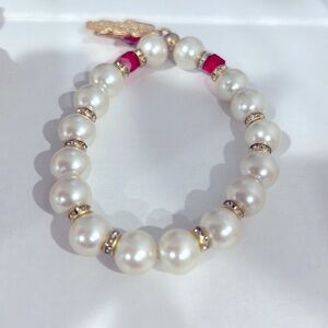 Hamsa Charm Bracelet with Faux Pearl Beads and Red and Gold Accent Beads