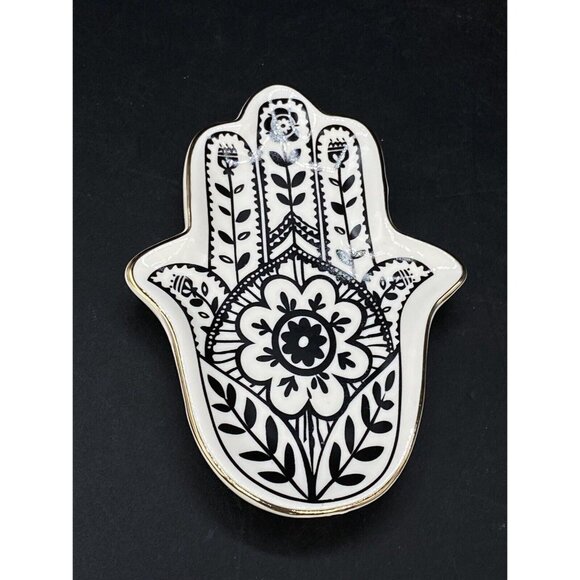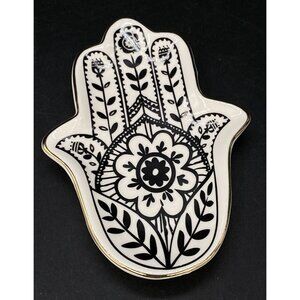 Hamsa Fatima Hand Trinket Dish Natural Life Black White Flower Design 4.5”