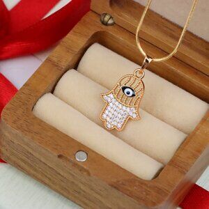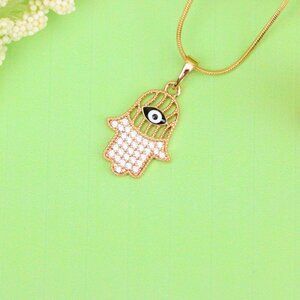 A protective and stylish piece, this Hamsa hand pendant features a crystal-studded palm and a striking evil eye detail, all set in radiant rose gold.
