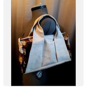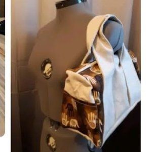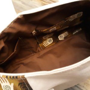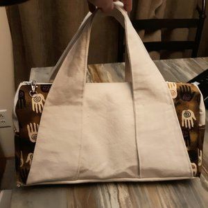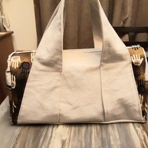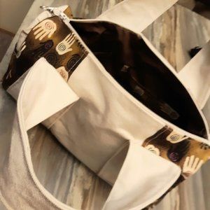 Hamsa Hands Boho vibe Purse Double handle Brown Pink print Ivory denim 12x8x5"