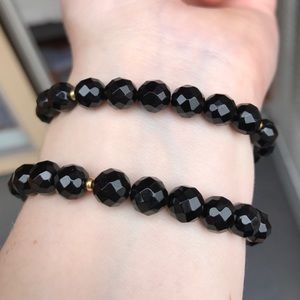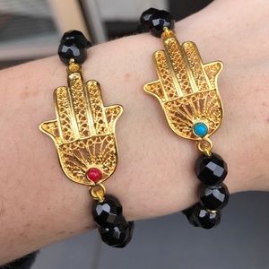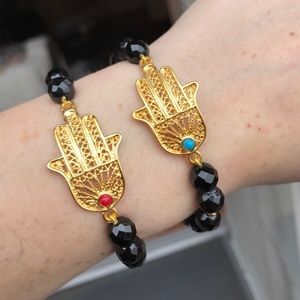 SMOKE/PET FREE. Stretch. Handmade by me. 8mm black agate stones with an 18k yellow gold plated hamsa connector. Fits a 6 - 7 inch wrist (fits 6 inch loose and 7 inch more fitted) *Depending on availability can be sized up or down just leave a comment.