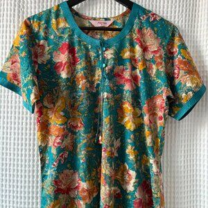 Silky teal floral maxidress/swim coverup/house dress. The brand is Hana. The fabric is very lightweight and feels like silk, but it could be viscose or polyester; there is no material or care tag. Button placket with a tie at the neckline. Pull-on styling. The floral print is beautiful. Tag says size medium. Flat, it measures 20 inches pit to pit with no stretch, and it's about 50 inches long. The hem and the sleeves appear to be handstitched. No idea of its origin.