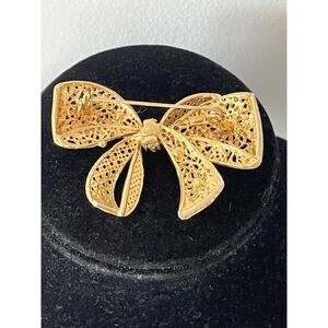 Hanae Mori Brooch Bow Articulating Filigree Pin Gold Tone Rhinestones Signed