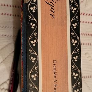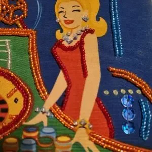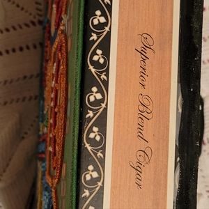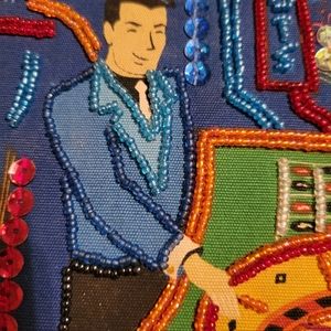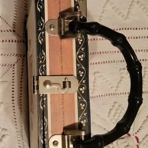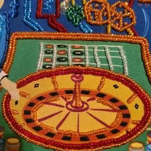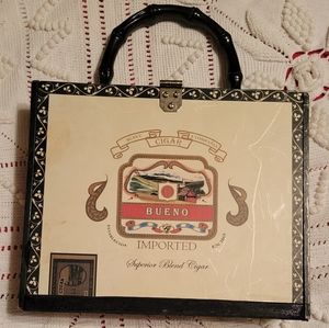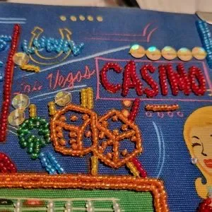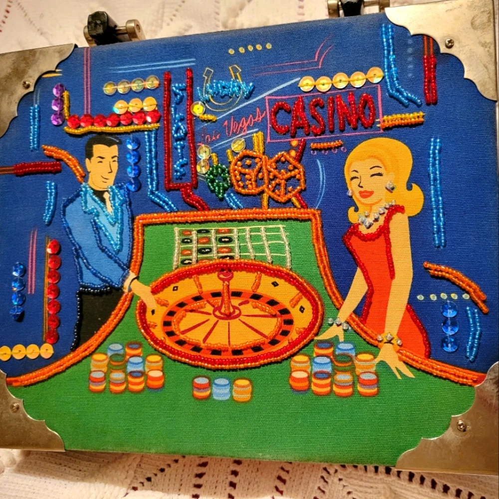 Selling this beautiful Cigar Box Handbag with Beading, Sequins and a black bamboo styled plastic handle, featuring a print of a Dealer & a lady at the Roulette wheel in a Casino.