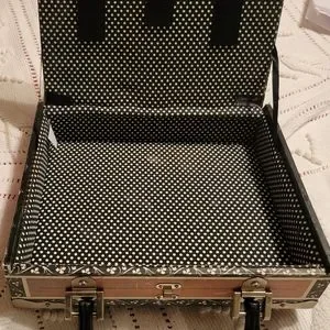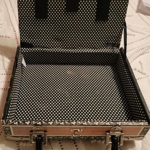 This item is in like new condition with a black and white polkadot lining and measuring 9.25" x 8" x 2.5" wide.