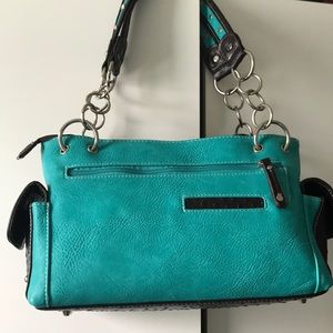 This beautiful blue hand bag was hand made. It has never been used and has a lot of detail. This purse just needs a new home.