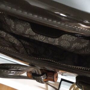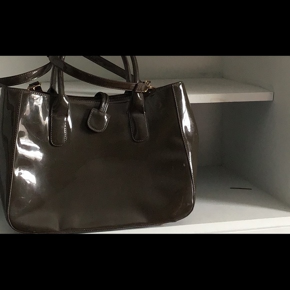 Brown patten leather larger cross body. Can be used as a lap top bag, carry on. Or just and every day larger purse
