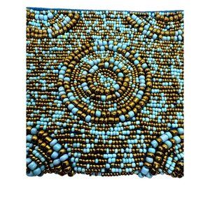 A meticulously crafted clutch showcasing an elaborate mosaic of blue and gold beads, arranged in mesmerizing circular patterns that radiate from central focal points. Each bead is carefully positioned to create a stunning, textured surface that catches light beautifully.
