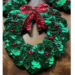 Hand Beaded Holly Ribbon Wreath Ornament Set of 4 - Henry Handwork - 2 Sided