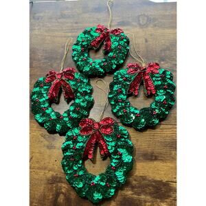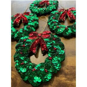 This is a delightfully unique set of 4 handmade Christmas ornaments from Henry Handwork made in USA. These charming ornaments feature hand-beaded holly ribbon designs on both sides. Each ornament is embellished with sequins and beads, giving them a puffy, dimensional look. Perfect for adding a touch of festive elegance to your holiday decor! These are in excellent condition and ready to be displayed on your tree or given as a thoughtful gift.