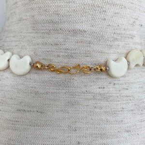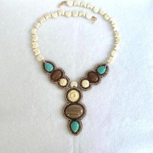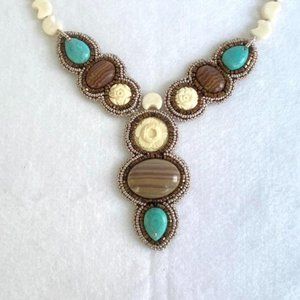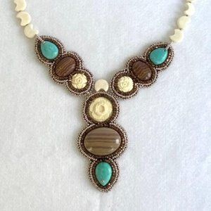 Artisan Handmade Hand Beaded Y Statement Necklace with Natural Stone, carved roses, Dyed Howlite and Brown accents Cabochons that resemble Tigers Eye and crescent shaped beads that make up the chain.
