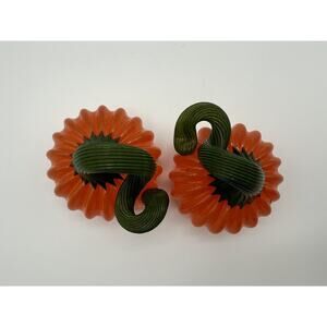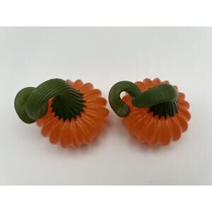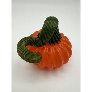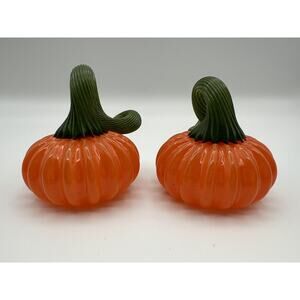 Lovely set of 2 Blown Art Glass Pumpkin Paperweights ~ Orange & Green Fall Decor. Pumpkins measure approx. 3” tall. Good condition, no chips or cracks.