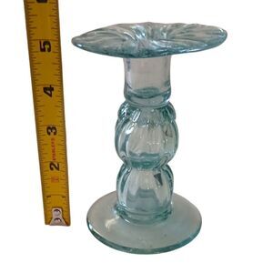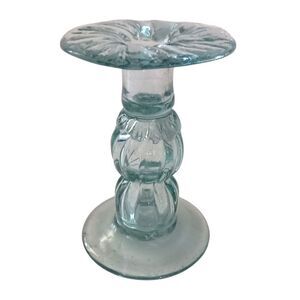 Hand Blown Art Glass Candlestick Holder Taper SINGLE ICY Blue Mexico Beachy Vtg. Condition is pre-owned with no chips or cracks. Hand blown art Glass in an icy blue color. Holds a taper candle. Measures about 5" tall. Please see all photos for detailed condition.