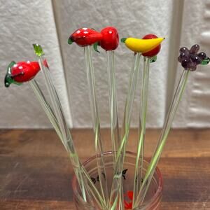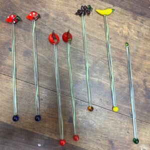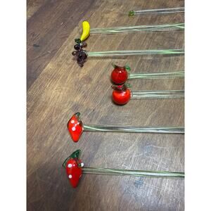 Hand blown glass fruit shaped swizzle sticks (strawberry, banana, grape, apple). There is dust in the small crevices. One of them has completely broken away, and I’m not sure what fruit it was originally. Included are two strawberries, two apples, one grape, one banana and one broken stirrer. This DOES NOT include the glass cup they are photographed in. No chips or cracks to the six intact stirrers.