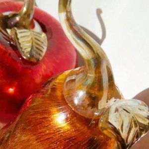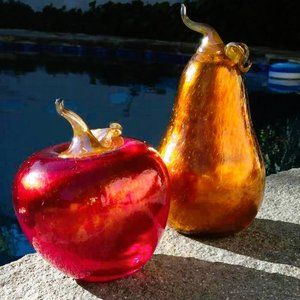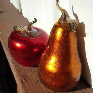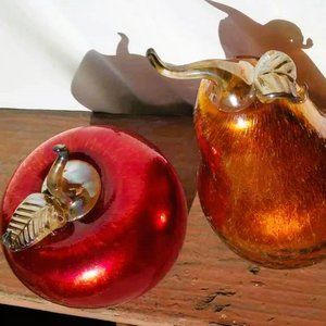 This is a gorgeous pair of Hand-Blown Art Glass in an Iridescent Red Apple and Orange Pear by glass artist Jesse Kelly and Signed on the undersides.