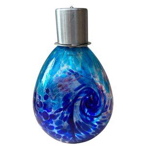Bring stunning artisan style and warm ambiance to your space with this hand-blown art glass oil lamp. 💙 Featuring mesmerizing swirls of blue, purple, and pink with a crackle-style finish, this teardrop-shaped lamp is topped with a sleek silver metal cap and wick. Perfect for cozy nights, unique home décor, or adding an artistic touch to your shelf or tabletop.