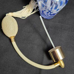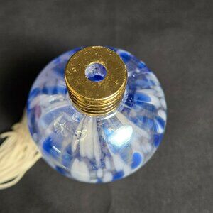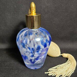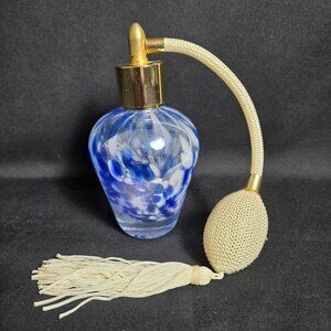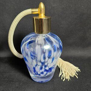 Lovely hand-blown art glass perfume bottle with a swirl of blue and white encased in clear glass. Features a gold-tone plastic atomizer top with a flexible woven fabric bulb and tassel.