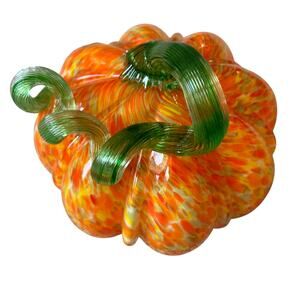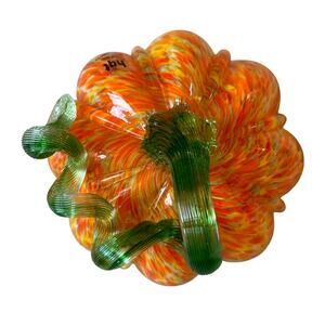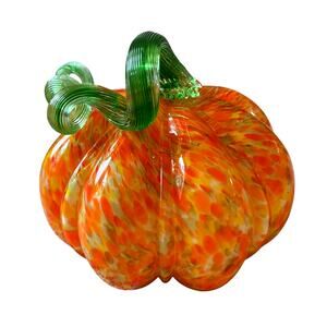 Hand Blown Art Glass Pumpkin Orange Speckled Green Stem Fall Home Decor New