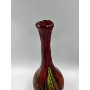 Hand Blown Art Glass Vase Red w/Yellow Green Black Swirls