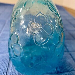 Hand Blown Blue Glass Bottle Raised Diamond Shaped Design 5.5” Tall Light Blue