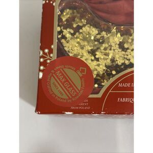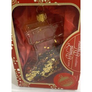 This is a hand-blown Christmas ornament from Kowalski in Poland, featuring a clear stocking filled with glitter. It is part of the ornaments collection and includes a Christmas Stocking. The ornament has a festive design and is perfect for decorating your Christmas tree or home during the holiday season.