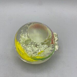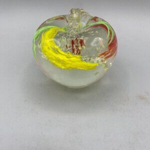 This hand-blown glass apple paperweight features a swirl pattern and vibrant multicolored hues, adding a decorative touch to any space. Crafted with art glass techniques, this original piece is handmade and showcases the beauty of hand-blown glass artistry. With its unique design and production style, this paperweight is a beautiful addition to any collection or as a standout decorative piece. Perfect for adding a touch of whimsy and elegance to any room.