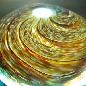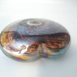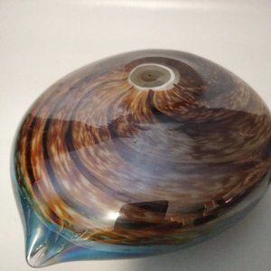 Unique handblown heart, Blues, Browns and White. Has a hole on the bottom side, Looks really cool with fairy lights inside or some sort of light source. The first picture has a light under it, I think it looks like a big brown iris. Very cool and unique piece to own.