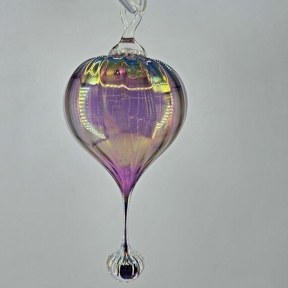 HAND BLOWN GLASS DELICATE IRIDESCENT ORNAMENT SUNCATCHER . MEASURES ABOUT 6" T, 2.5". IN GREAT CONDITION, NO FLAWS (JUST LIGHTING AND ME AND EVERYTHING ELSE REFLECTING).