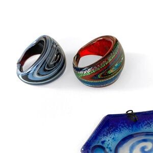 Two hand blown swirl glass rings and one hand blown swirl necklace pendant jewelry bundle. All are in good condition. Rings are size 10, pendant measures 1.5” x 2”