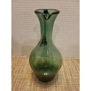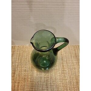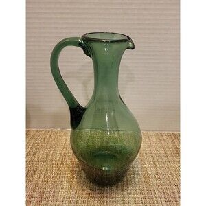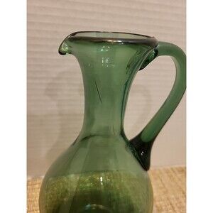 This beautiful green glass pitcher is a must-have for any collector. It features a unique hand blown glass design with bubbles at the bottom, adding a touch of elegance to your decor. The pitcher is perfect for serving your favorite beverages and is ideal for any occasion. Made from high-quality glass, this pitcher is durable and will last for years to come. .