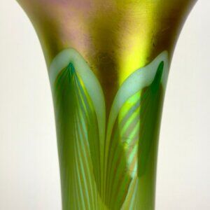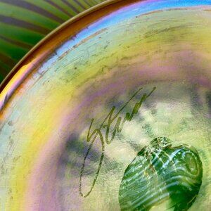 This exquisite hand-blown glass decanter features a mesmerizing iridescent finish with ethereal swirls of green, pink, and subtle rainbow hues. Accented by delicate speckled details and soft dripping patterns, each angle of this statement piece reveals artistry reminiscent of studio glass movements from the 1990's.