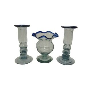 Hand Blown Recycled Mexican Glass Cobalt Blue Rim Candle Holder Set 3