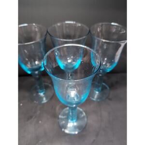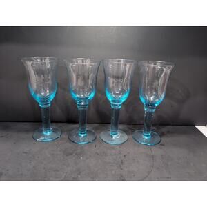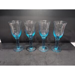 Hand Blown Sky Blue Wine Glasses, Long Stem, Vintage Set of 4, Heavy Glassware