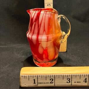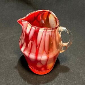 Beautiful red, amber and white hand blown creamer pitcher with a clear handle.