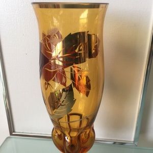 Gorgeous very rare VTG Hand Blown amber color with ruby&gold infusion 9.5'' Czech Republic Vase. Deametr on the top 3''. Good condition, one small chip on the top. Hand blown art glass with rich gold decoration. Please check all pictures for details.
