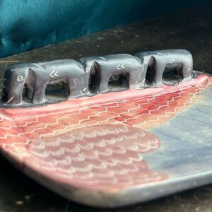 Hand carved in Kenya from soapstone. Tray area for soap, trinkets, jewelry or keys