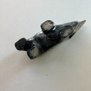 This vintage hand-carved gray ONYX stone bear figurine stands at 8 inches tall, showcasing intricate details and craftsmanship. Handmade from a single piece of stone, this collectible piece captures the essence of a bear with its unique design and texture. Perfect for collectors of wildlife figurines or animal enthusiasts, this vintage piece adds a touch of charm and character to any space.
