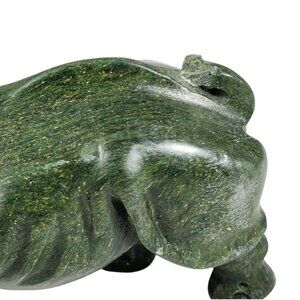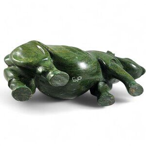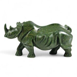 Hand carved green stone rhinoceros figurine, signed “SP” on the underside.