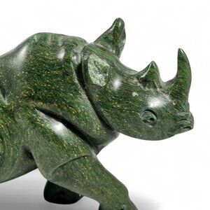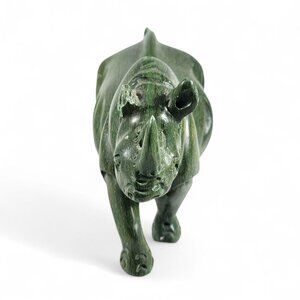 Solid stone with natural veining, detailed carving of a rhino in motion. Great collectible safari decor piece or natural stone sculpture.