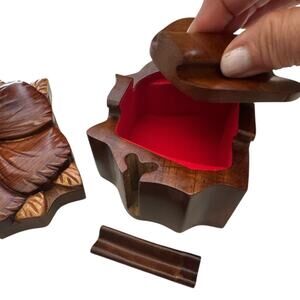 Beautiful, preowned condition. This hand carved hibiscus flour box has a special bar key that slides up and out and allows. You to take off two pieces in order to see a red felt lined secret space. This is a beautiful piece for anyone who loves puzzles, or a great way to offer someone a special piece of jewelry. A piece to be admired forever, it has dark and light woods with beautiful patina approximately 5 inches across 3 1/2 inches long and 2 1/2 inches high. The opening and side is approximately 2 1/2“ x 2 1/2“ x 1“ deep. polished up and ready to give to a special person or to keep for yourself.