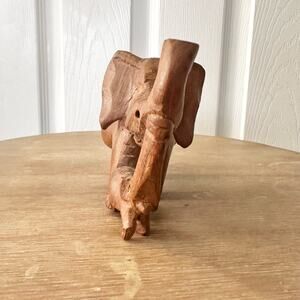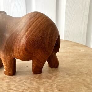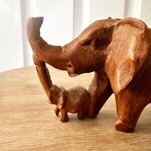 Hand carved. Made in Kenya. Solid wood mother baby elephant walking duo trunk up. Missing horns. Preowned. See photos for condition.