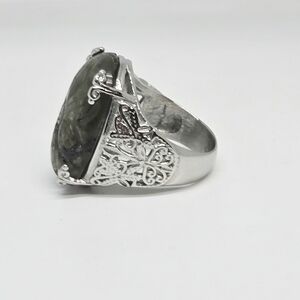 Hand Carved Malagasy Labradorite Dragon Flower Ring in Stainless Steel 11.65 ctw