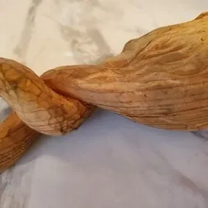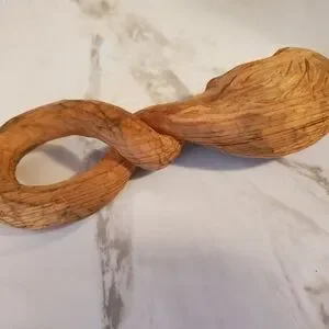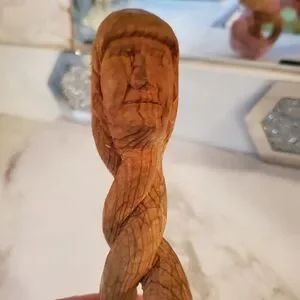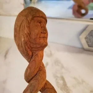 Hand carved man with rope handle.Made of wood,lightweight, measures 7 high and 2 1/2 wide.