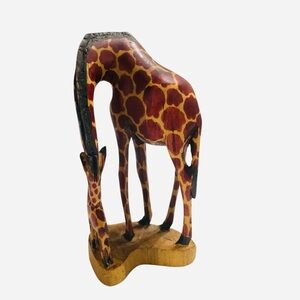 Hand Carved Mother Giraffe with Nursing Baby Wood Figurine 8”tall Made in Kenya