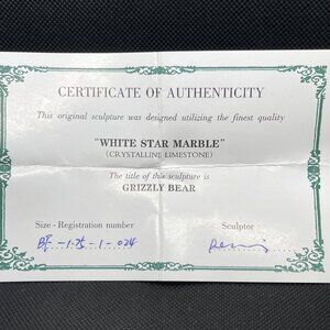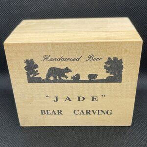 This exquisite set of hand-carved bear figurines is made from genuine "white star marble" (crystalline limestone) and features a green nephrite "B.C. Jade" fish. This set is a classic Canadian/Alaskan souvenir and includes the main bear, two small cubs, its original wooden gift box, and the Certificate of Authenticity (COA) shown in the photos.