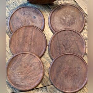 Hand Carved Wood Coasters Set Of 6, Vintage