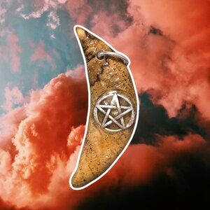 This piece is hand carved with a pentacle medallion recessed into the wood, finished in a food-grade lacquer. It comes with an adjustable black cord. See photos for scale.